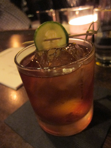Next, I tasted the Pardon (bourbon, Pimm’s #1, curacao, cucumber, orange oil). For those expecting something lighter along the lines of a Pimm’s cup might be surprised by this drink. Being a whiskey fan, I was all about it.