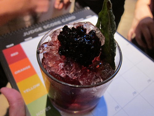 The MC and fellow judge bar owner Dave Whitton explained to me the rules. There would be five teams of two bartenders. Each team was headed up by a well-known bartender and the budding mixologists worked with them to come up with a winning recipe. The bartenders raced for ingredients and then had 20 minutes to come up with the recipe. They had to batch the drink immediately for the large crowd. Watch the bartenders race here.