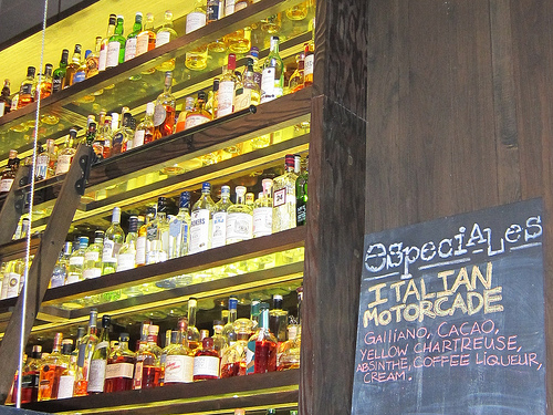 Jeremy’s Italian Motorcade features Galliano, Creme de Cacao, Yellow Chartreuse, coffee liqueur and cream. First he rinses the cocktail glass with absinthe and then adds the stirred cocktail. To finish, he tops the drink with thick cream poured carefully over a bar spoon. Initially the drink would seem like a dessert drink with the rich cream and chocolate/coffee flavors but the kick of absinthe and chartreuse really comes through. And delightedly, the Galliano comes through and lingers at the finish. It really was a special drink.