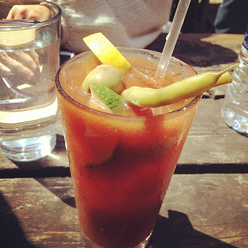 Day drinking at its finest: Red Snapper on the patio. A Red Snapper is a Bloody Mary with gin instead of vodka.