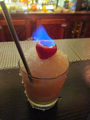 What’s more tiki than something on fire? This Strawberry Colada on Fire was actually inspired by one of Bahooka’s drinks.  Nicaraguan rum is combined with housemade strawberry syrup and pineapple reductions, coconut cream and lime over crushed ice. A hulled strawberry is filled with Lemonhart 151 and lit on fire. It was fantastic.